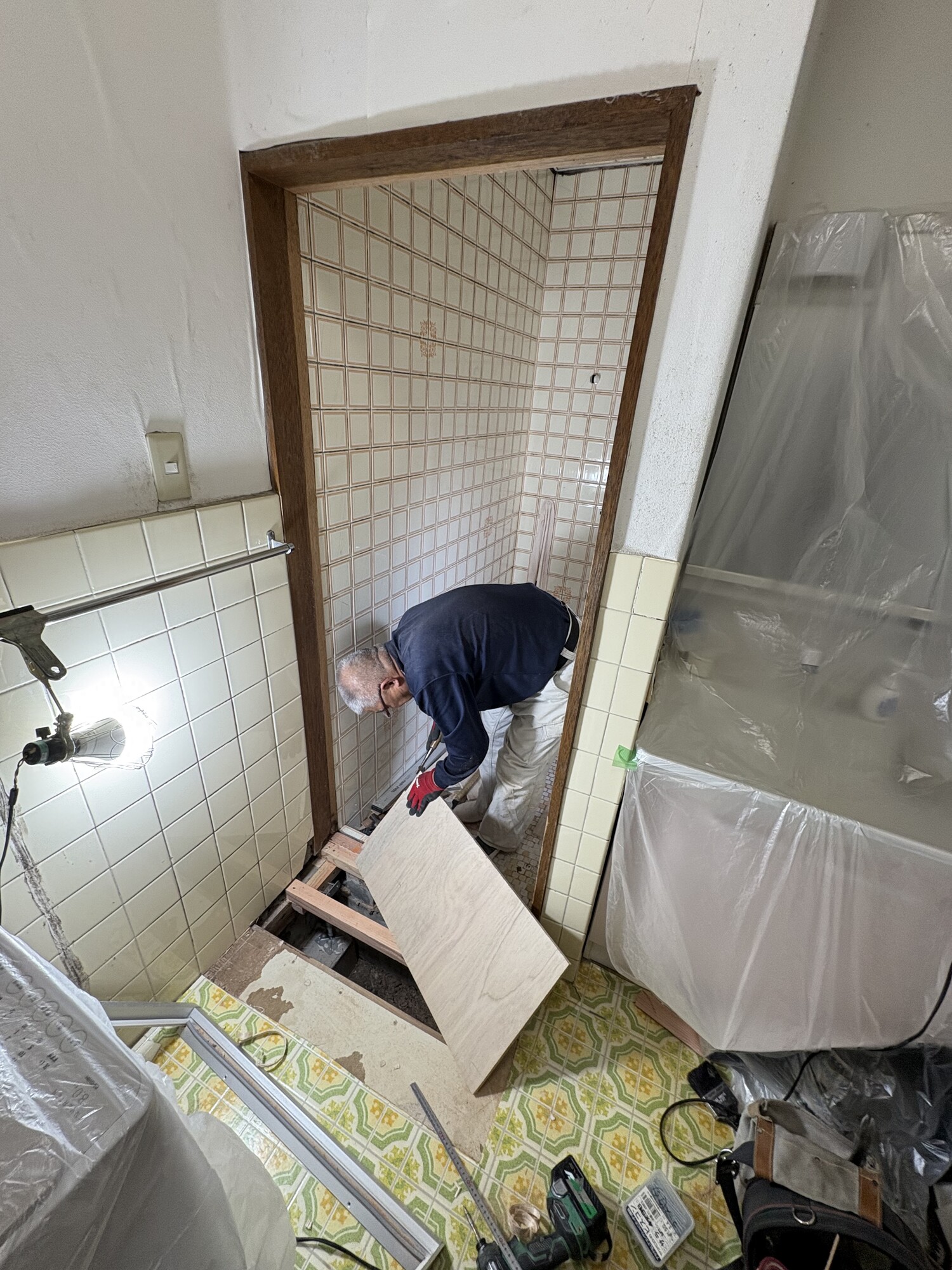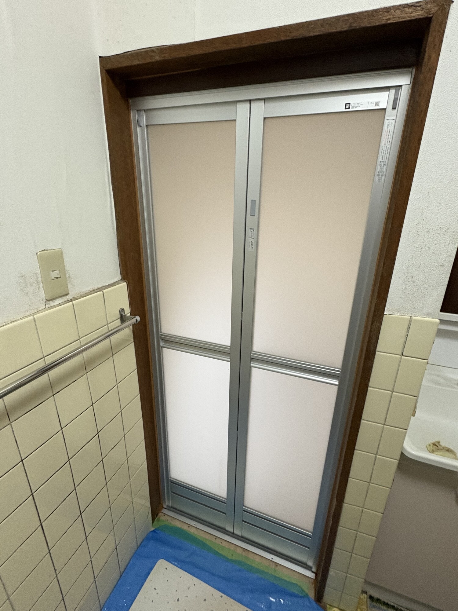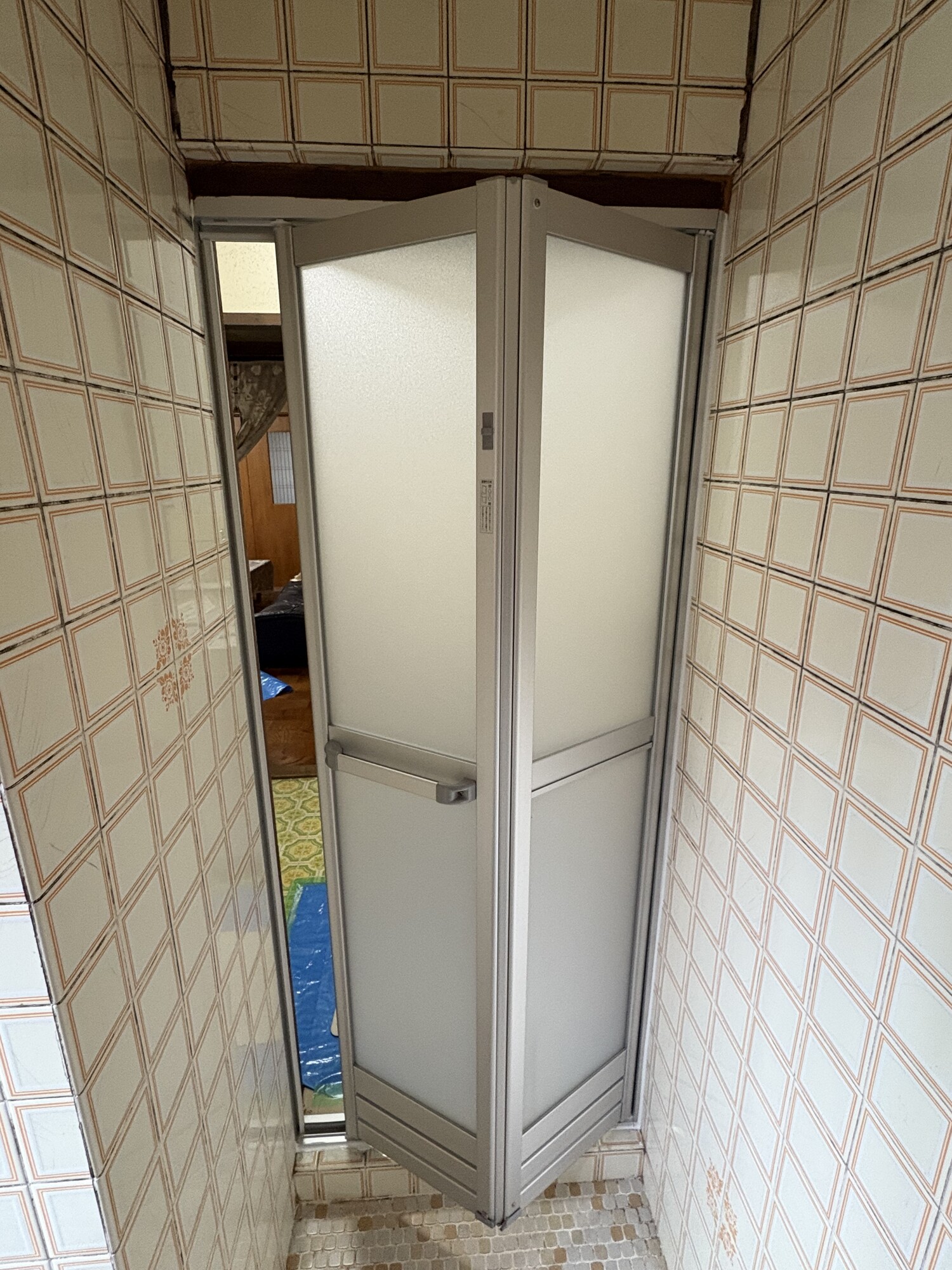 お風呂の扉の枠下地と脱衣所の床が湿気で朽ちてしまったので床とお風呂枠の下地をやりかえて扉も折れ戸に交換しました。