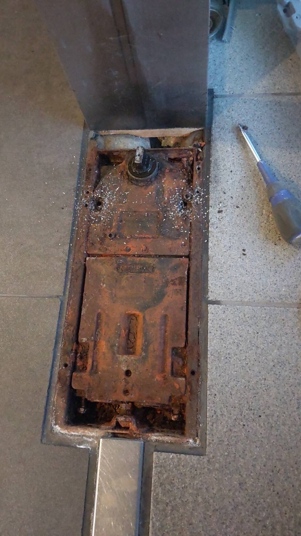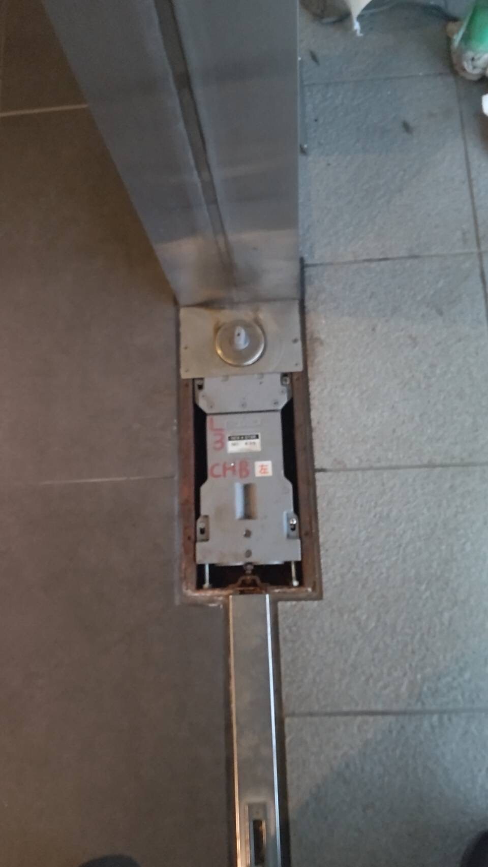 マンションエントランスの入り口扉のヒンジが錆びて開閉が出来なくなってしまったのでフロアヒンジの交換をしました。