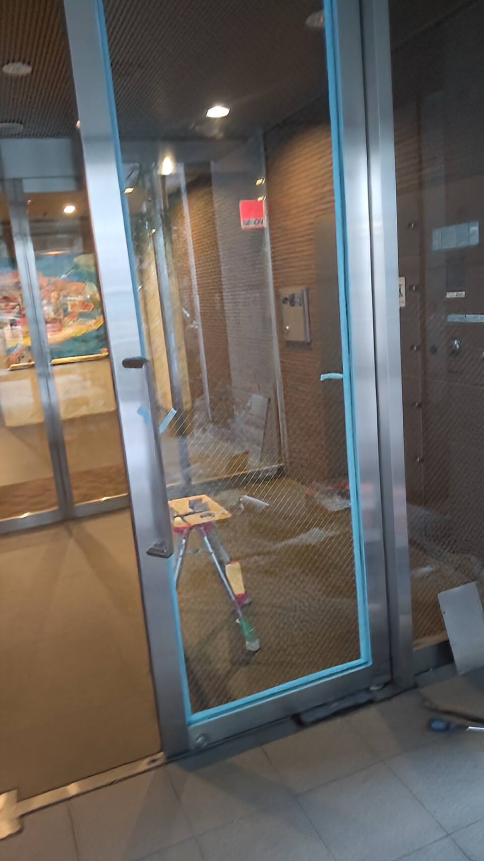 マンションエントランスの入り口扉のヒンジが錆びて開閉が出来なくなってしまったのでフロアヒンジの交換をしました。