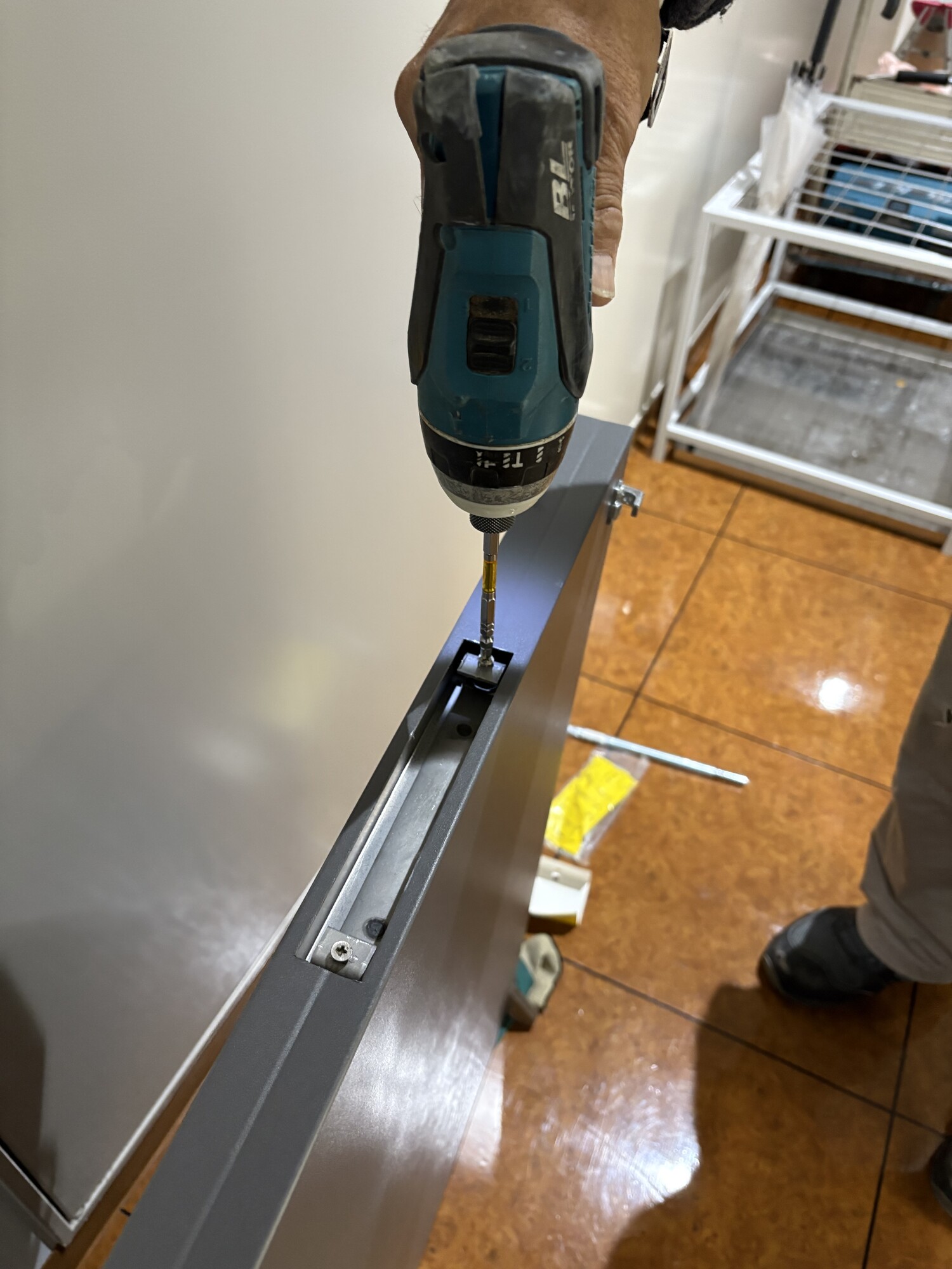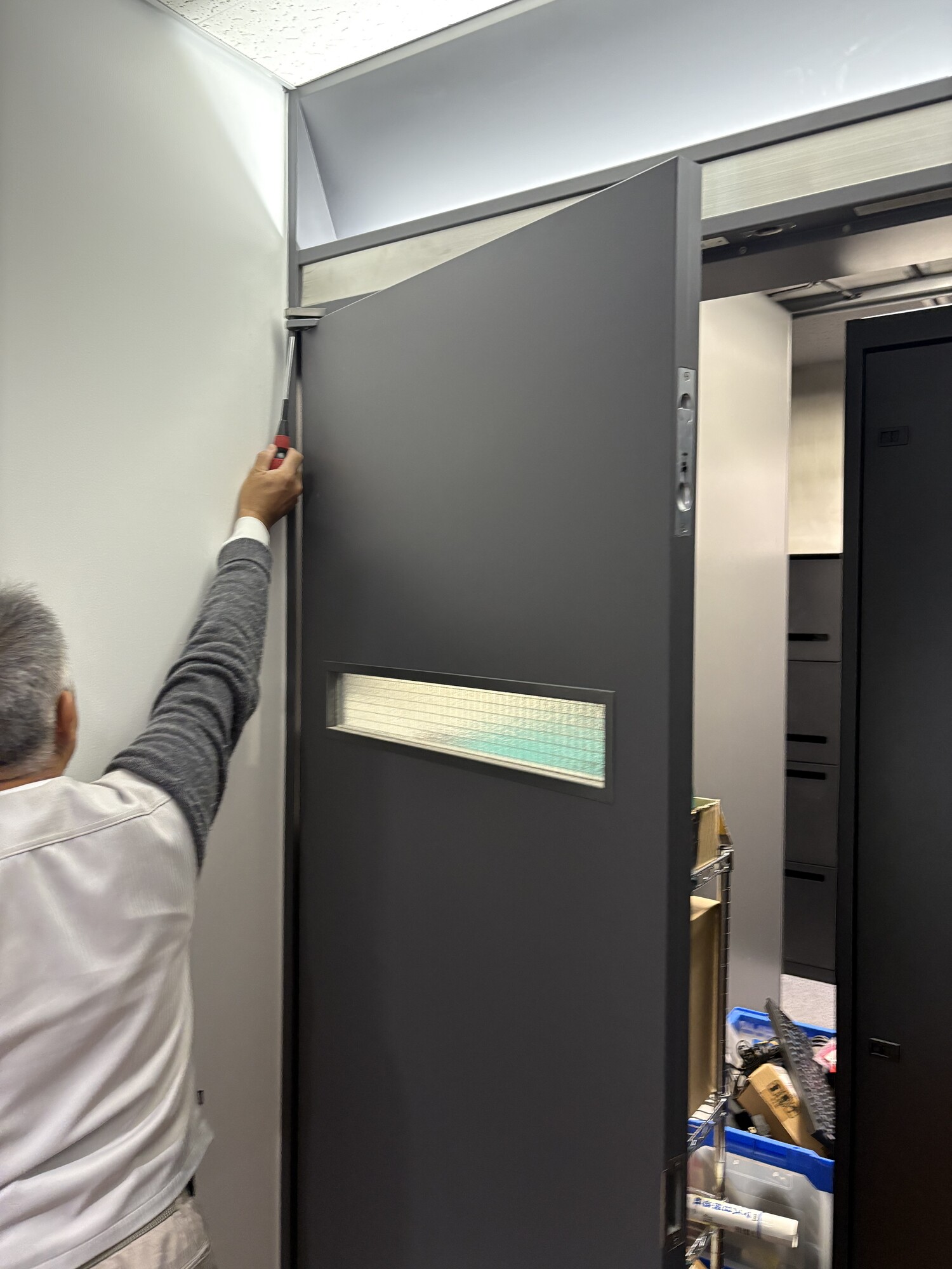 フロアヒンジの扉だったので扉を外しての交換になりました。