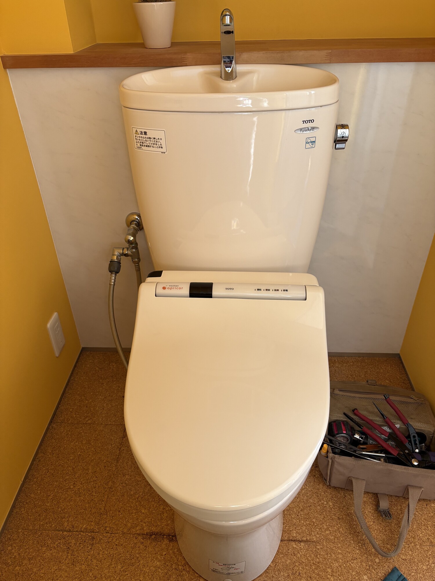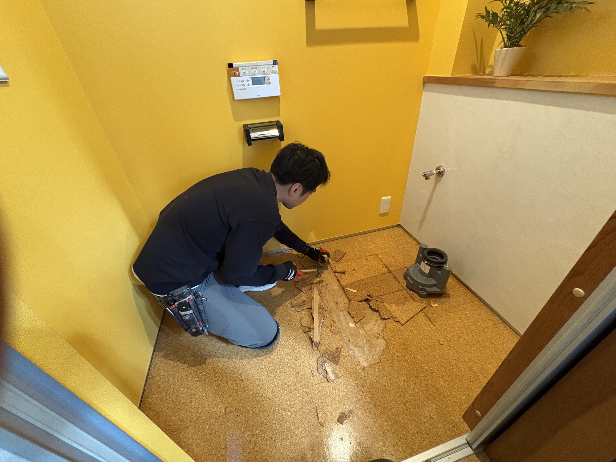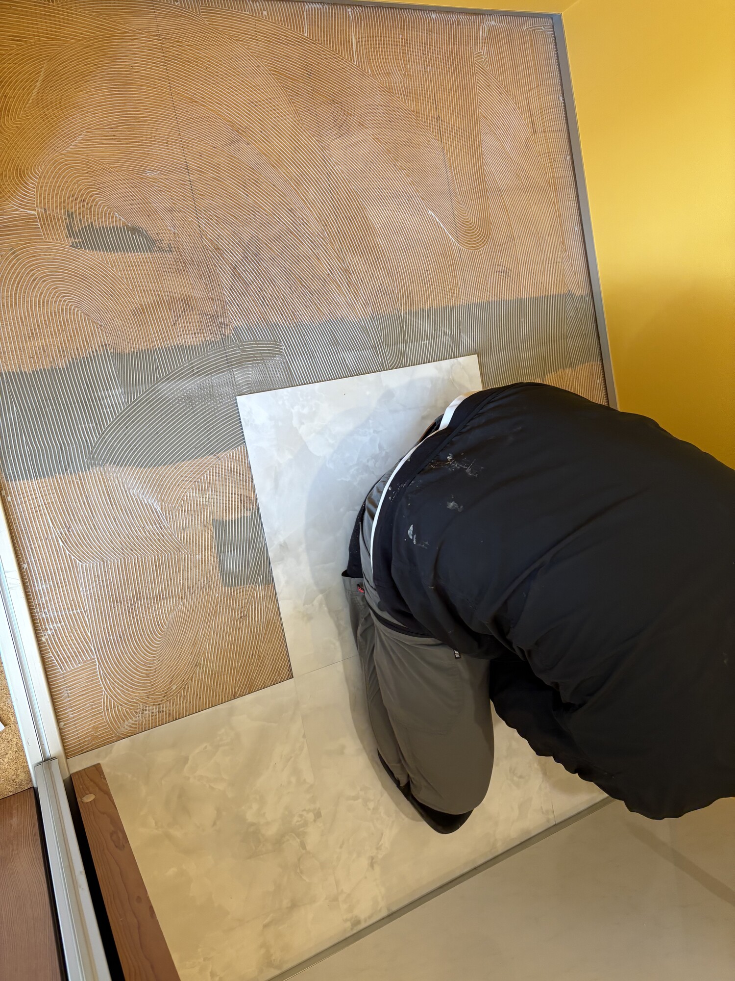 コルク素材から大理石調のフロアタイルに変え見栄えも変わり掃除もしやすくなりました。